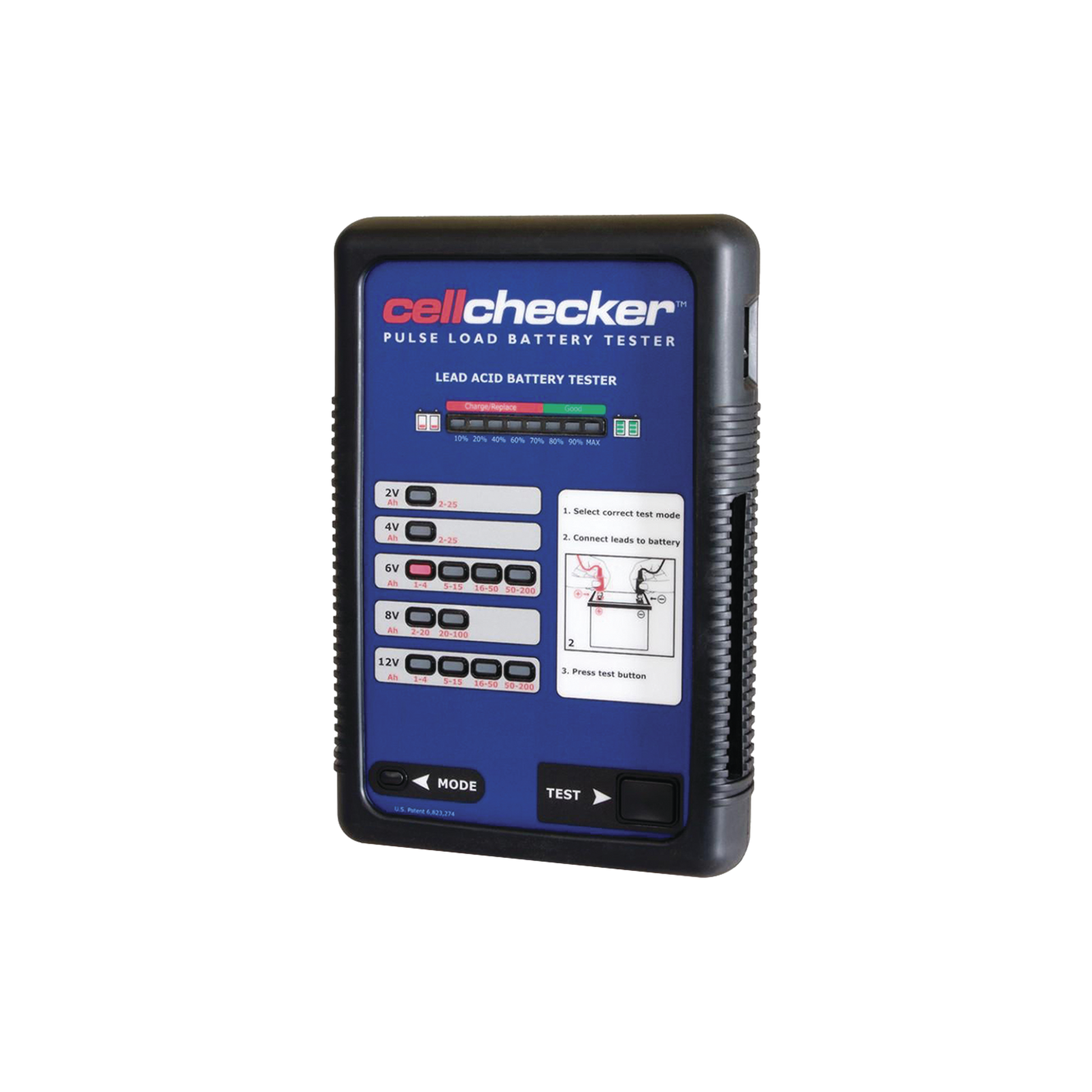 - Para probar baterías de: 2, 4, 6, 8 o 12 V, hasta 200 Ah